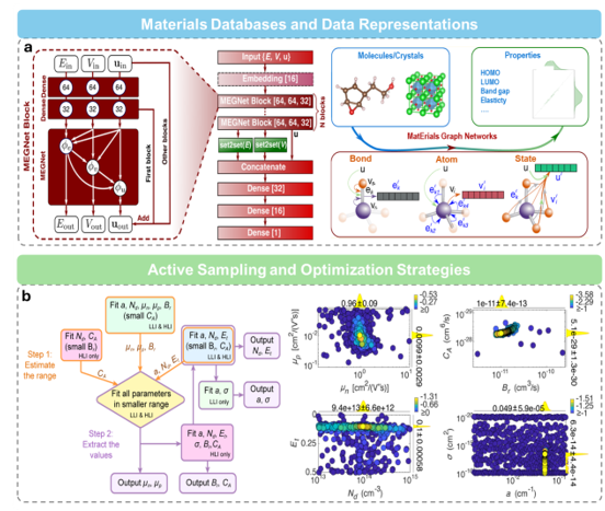 图3. 数据基础设施和主动采样。(a)通用MEGNet图形网络能够对分子和晶体进行准确且可转移的属性预测(b)从模拟TRPL数据中提取材料属性的多参数工作流程。
