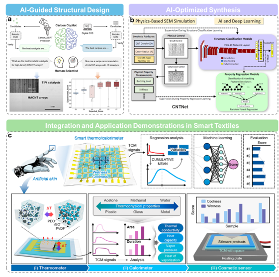 图4. 用于智能纺织品的人工智能碳基纳米材料。(a)用于碳材料结构设计和功能化的人工智能引导的CARCO平台。(b)用于碳纳米管森林合成中基于图像的分类和属性预测的人工智能优化的CNT Net框架。(c)用于多功能纺织品传感的集成智能健康监测系统示意图。