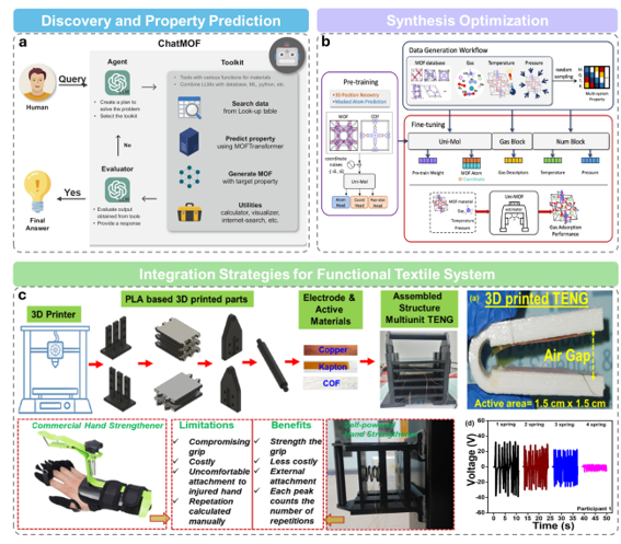 图6. 用于智能纺织品的AI赋能MOF/COF纳米粒子。(a)用于材料发现和性能预测的ChatMOF的概念和示意图。(b)Uni-MOF框架的示意图,Uni-MOF框架是一种用于大规模三维MOF表示学习的创新框架,专为多用途气体预测而设计。(c)基于COF和AI指导的TENG逐层组装过程。