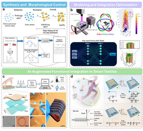 金属基纳米粒子因其优异的电学、光学和催化特性,是构建智能纺织能量与信号转换单元的重要基础。AI的介入显著提升了金属纳米粒子合成的精准度与可控性。通过基于决策树的机器学习模型,可快速优化反应条件,实现粒径、形貌与分散度的精确调控;同时,利用自适应算法构建的合成流程能够在实验过程中实时调整参数,降低试验次数并提高产率。此外,AI还推动了金属纳米粒子在柔性系统中的功能拓展——例如基于光谱学习(OST)的仿生人机交互(HMI)系统,通过金属纳米复合膜实现生物信号可视化与能量自供给;结合机器学习辅助设计的刺绣型传感织物,则实现了多点触觉与力学信号的空间映射,为可穿戴交互提供了新范式。