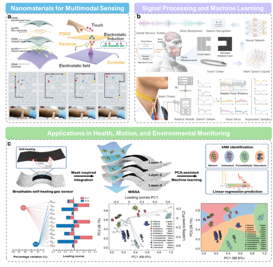图8. 用于智能纺织品的AI增强传感平台系统。(a)AI增强型可拉伸透明摩擦电传感器矩阵,用于在智能纺织品中快速实现触觉映射。(b)AI增强型FLG纺织应变传感器和神经网络,用于在可穿戴智能纺织品中实现高精度静音语音解码。(c)AI驱动的自修复可穿戴传感器阵列,用于实时VOC检测和个人健康监测。