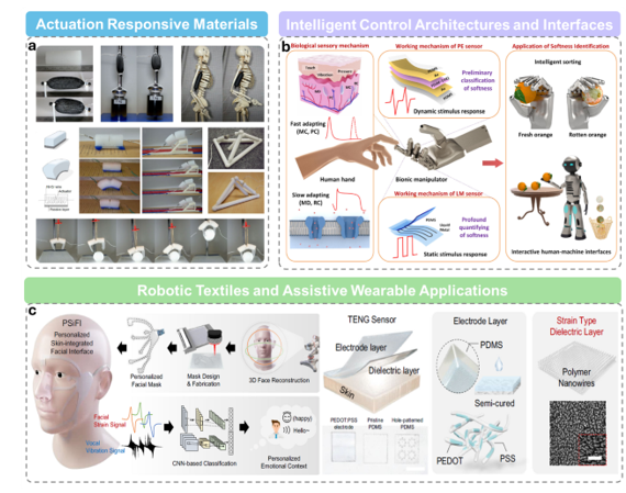 图9. 用于智能纺织品的人工智能增强型交互式机器人纺织系统。(a)用于下一代机器人纺织系统的高应变、低成本电驱动软复合执行器。(b)电子皮肤可在机器人纺织系统中实现柔软度识别和自适应抓取。(c)用于智能纺织系统中实时多模态情绪识别的皮肤集成界面。