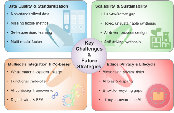 总体来看,AI的引入正在重塑材料科学与纺织工程的研究范式,使智能纺织系统从“功能叠加”迈向“系统智能”。然而,该领域的持续发展仍面临若干关键挑战: