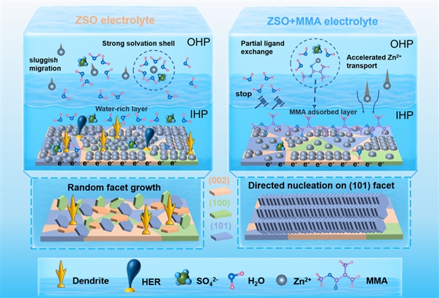 2. 揭示界面分子取向与晶面选择性生长机制,MMA分子在界面定向排列,诱导Zn沿(101)晶面择优取向沉积,实现横向致密生长并有效抑制枝晶形成。