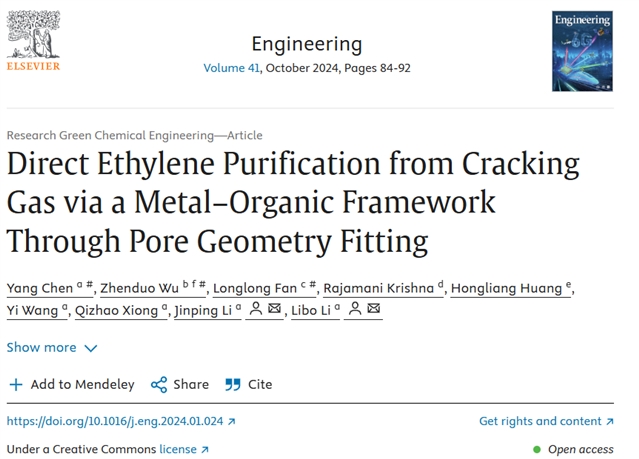 太原理工大学团队创新MOF材料设计,实现裂解气中乙烯一步高效提纯 Engineering |