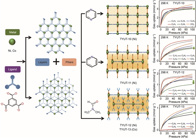 图1 结构设计和气体吸附性能。不同层柱撑MOF的结构调控示意图及其C3H8、C3H6、C2H6、C2H4、C2H2和CO2的吸附等温线。