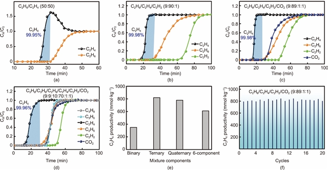 图2 C2H4的分离性能。在298 K和100 kPa下,不同C2H4含量混合物在TYUT-12上的实验穿透曲线。(a)C2H6/C2H4(50∶50);(b)C2H6/C2H4/C2H2 (9∶90∶1);(c)C2H6/C2H4/C2H2/CO2(9∶89∶1∶1);(d)C3H8/C3H6/C2H6/C2H4/C2H2/CO2(9∶9∶10∶70∶1∶1);(e)分离不同组分获得 C2H4 (纯度大于99.95%)的产率;(f)在298 K下进行C2H6/C2H4/C2H2/CO2(9∶89∶1∶1)的20个连续分离循环中C2H4(纯度大于99.95%)的产率。CA 是即时出口浓度,C0是平衡时的出口浓度。