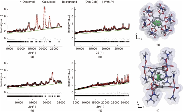图4 中子粉末衍射数据。(a)~(d)C2D4负载TYUT-12的Rietveld精修结果(10 K,从探测组3~6收集),精修拟合优度参数:(a)Rwp = 0.0311;(b) Rwp= 0.0144;(c)Rwp = 0.0143;(d)Rwp = 0.0163。(e)、(f)TYUT-12中C2D4的相应吸附位点。