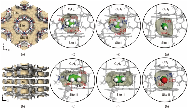 图3 (a)、(b)DFT计算获得的不同气体在TYUT-12中的优先吸附位点;(c)C3H8;(d)C3H6;(e)C2H6;(f)C2H4;(g)C2H2和(h)CO2(Ni,青色;C,灰色;H,白色;O,红色;N,蓝色)。蓝线和红线分别代表结构和气体分子之间的相互作用。单位:Å。