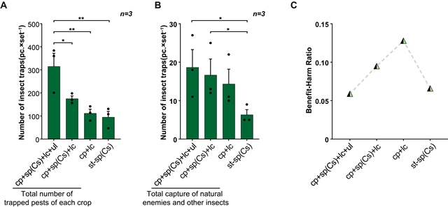 A:各作物害虫总诱量;B:天敌等昆虫总诱量;C:四种装置中益虫与害虫比值。