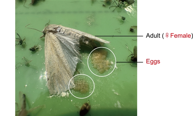 图10 透光型三诱装置诱捕的二化螟雌蛾及其所产卵块