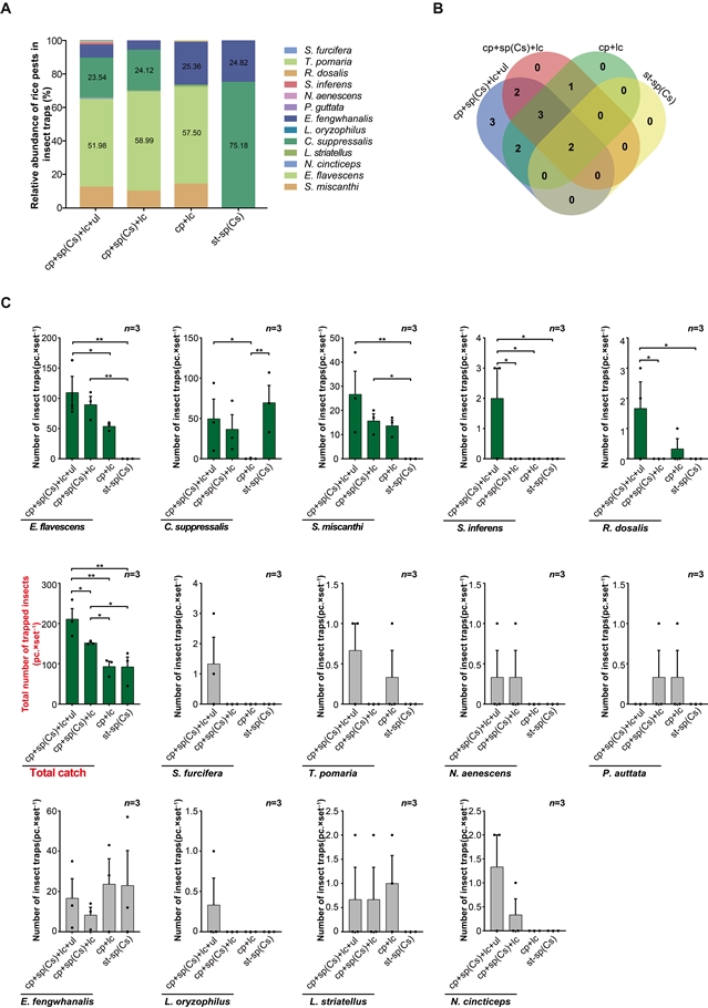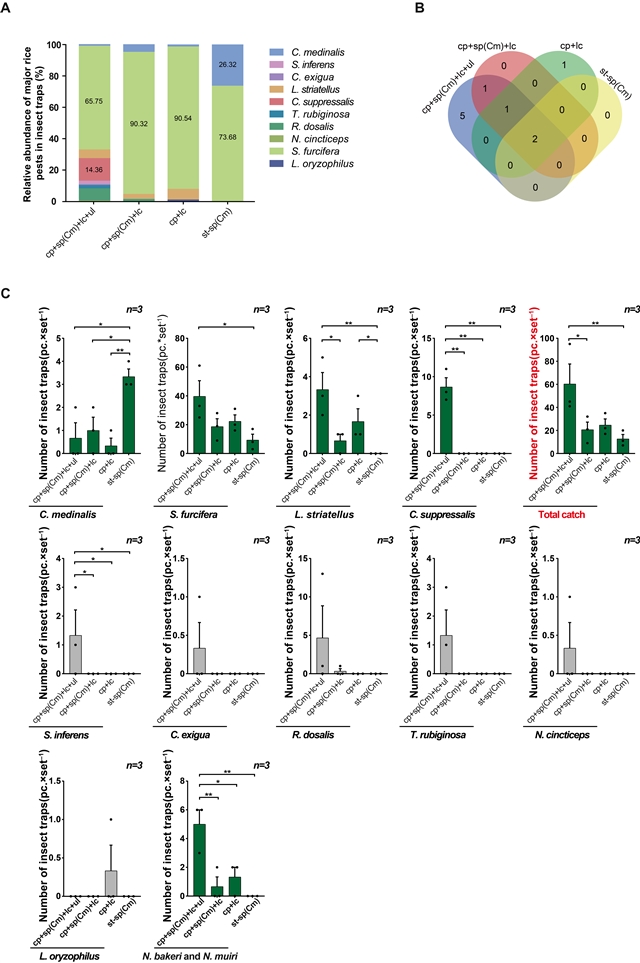 A:诱水稻害虫相对丰度,B:诱水稻害虫种类;C:对比诱测水稻集中主要害虫。