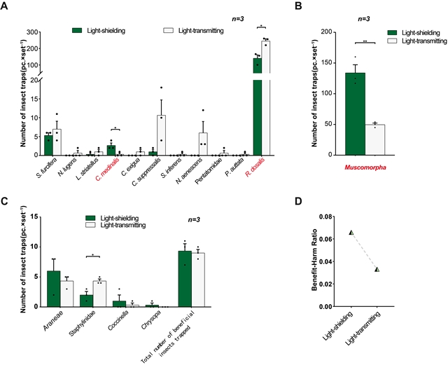A:3种装置诱捕天敌益虫总量比较,B:3种装置对不同种类的天敌等益虫诱捕数量的比较,C:3种装置中对非靶标苍蝇类诱量比较;D:3种装置的诱集益害比值。