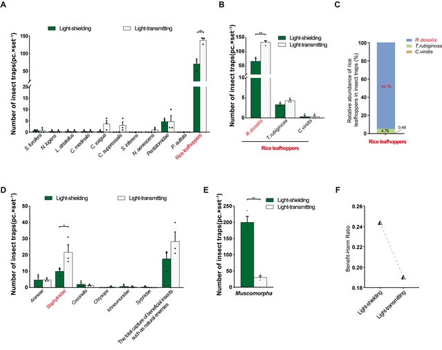 A:对比诱测几种水稻主要害虫; B和C:对比诱测稻叶蝉类(电光叶蝉、白翅叶蝉和大青叶蝉);D:对比诱测天敌益虫;E:对比诱测非靶标苍蝇类;F:益害比。