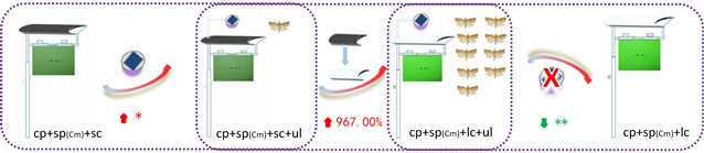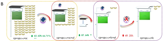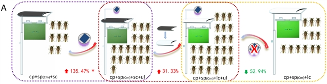 (A:白背飞虱;B:稻纵卷叶螟; *和**分别表示差异显著(p < 0.05)和差异极显著(p < 0.01)。“↑(红色)”和“↓(绿色)”分别表示增加和减少。“×(红色)”表示删除紫外线灯。)