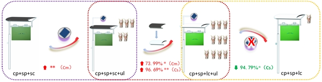 (*和**分别表示差异显著(p < 0.05)和差异极显著(p < 0.01)。“↑(红色)”和“↓(绿色)”分别表示增加和减少。“×(红色)”表示删除紫外线灯。)