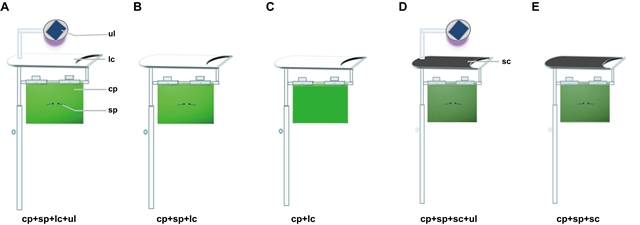 A:透光型三诱装置;B:透光型双诱装置;C:透光型色板装置;D:遮光型三诱装置;E:遮光型双诱装置;太阳能自动诱虫灯(ul)、防雨防尘透光罩(lc)、防雨防尘遮光罩(sc)、嫩绿色粘虫板(cp)、昆虫性信息素诱芯(sp)