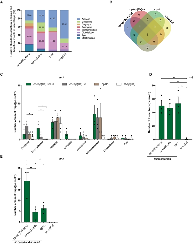A:诱天敌益虫相对丰度,B:诱天敌益虫种类,C:对比诱测天敌益虫;D:诱非靶标苍蝇类;E:诱捕非靶标拟褐飞虱和伪褐飞虱。