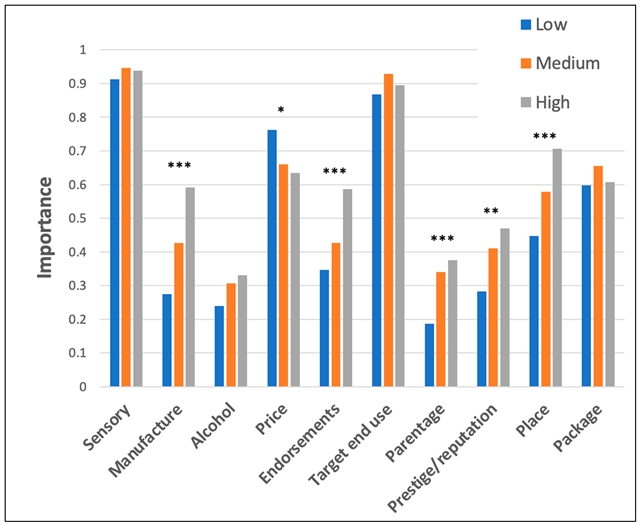 图为购买线索的重要性与葡萄酒涉入度(低、中、高)的关系。*、**、*** 分别表示 p(X2) < 0.05、0.001 和 0.0001。