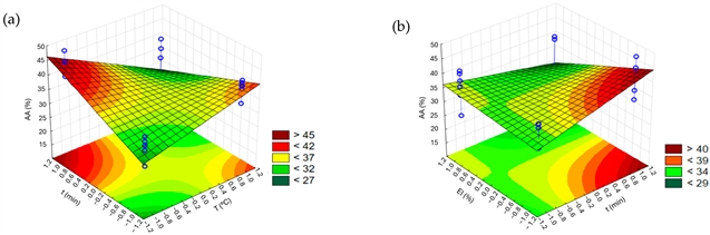 图为澄清时间与温度 (a) 和酶添加量 (b) 对澄清古布阿苏果汁抗氧化活性的影响响应曲面。AA = DPPH 法测定的抗氧化活性。T = 澄清过程温度;t = 澄清过程时间;El = 酶添加量