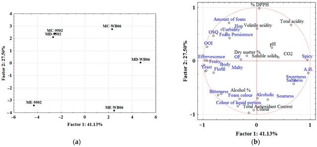 图为对物理化学(黑色)和感官数据(蓝色)集沿第一和第二个主成分应用 PCA 获得的 (a) 得分和 (b) 载荷的双标图