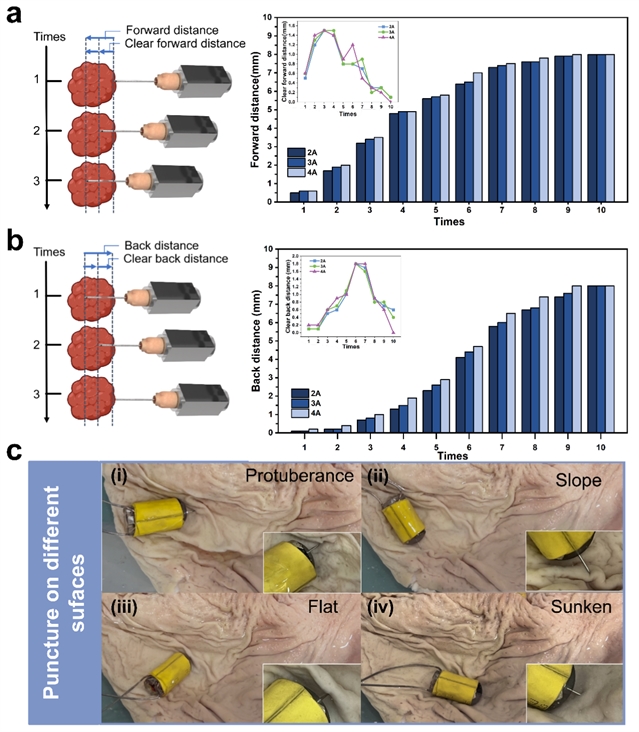 图2.PBR穿刺距离评估及猪胃内针对不同形态肿瘤表面穿刺。(a)进针示意:穿刺总距离与净距离;(b)退针示意:回退总距离与净距离;(c)PBR在猪胃内针对不同形态肿瘤表面穿刺:(i)突起面(ii)斜面(iii)平面(iv)凹陷面。