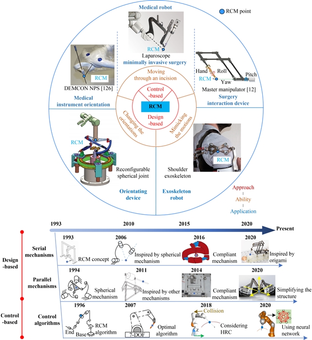文章从串联RCM机构、并联RCM机构和RCM控制算法三个方面展开,探讨了RCM的实现方法。其中,串联RCM机构可通过运动副串联叠加设计,具有RCM运动特性的运动副包括旋转副、圆弧导轨、直线副,以及具有1-DOF RCM运动的广义运动副,不同自由度(1-DOF到4-DOF)的串联RCM机构有着不同的设计、应用及性能特点。并联RCM机构相比串联机构结构更复杂,其运动旋量系为所有支链运动旋量系的交集,不同自由度的并联RCM机构在设计特点、应用场景及性能分析上也存在差异。基于机构设计的RCM方法更安全且应用广泛,而基于控制算法的RCM方法主要用于医疗机器人,文章描述了满足RCM约束的机器人雅可比矩阵,从末端执行器RCM点约束算法、冗余串联机器人RCM算法、人机协作机器人RCM算法展开讨论,并讨论了近年来机器学习在该算法中的应用。