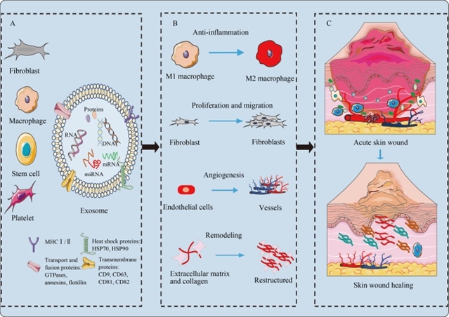 急性皮肤伤口通常由手术、创伤、浅表烧伤或擦伤引起,可能导致感染、愈合延迟、瘢痕形成等并发症,不仅消耗大量医疗资源,还可能影响患者的心理健康,已成为全球公共卫生关注的重要问题。目前,皮肤损伤修复的传统方法包括细胞疗法和组织工程皮肤。细胞疗法通过干细胞分化为皮肤细胞、内皮细胞等促进再生,但存在免疫排斥、干细胞异常分化形成肿瘤等风险,且培养过程耗时昂贵;组织工程皮肤虽能提供支架支持,但细胞外基质(ECM)在培养中可能发生表型和功能改变。在此背景下,外泌体疗法作为一种新型治疗策略逐渐受到关注。外泌体是干细胞等多种细胞分泌的纳米级细胞外囊泡,通过细胞间通讯调控组织修复,且能避免干细胞疗法的潜在风险。然而,外泌体疗法的临床应用仍面临分离纯化效率低、产量有限、体内分布不均等挑战,亟需优化关键技术以推动其转化应用。
