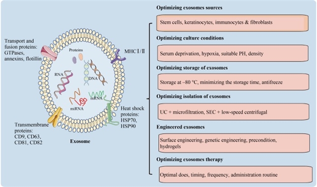 图3 急性皮肤伤口愈合中外泌体产量和疗法的优化,包括外泌体来源、培养条件、储存条件、分离、基因工程的优化,以及外泌体的最佳剂量、时机、频率和给药方案