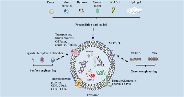 图4 用于皮肤伤口愈合的工程化外泌体,包括表面工程、基因工程、预处理和负载