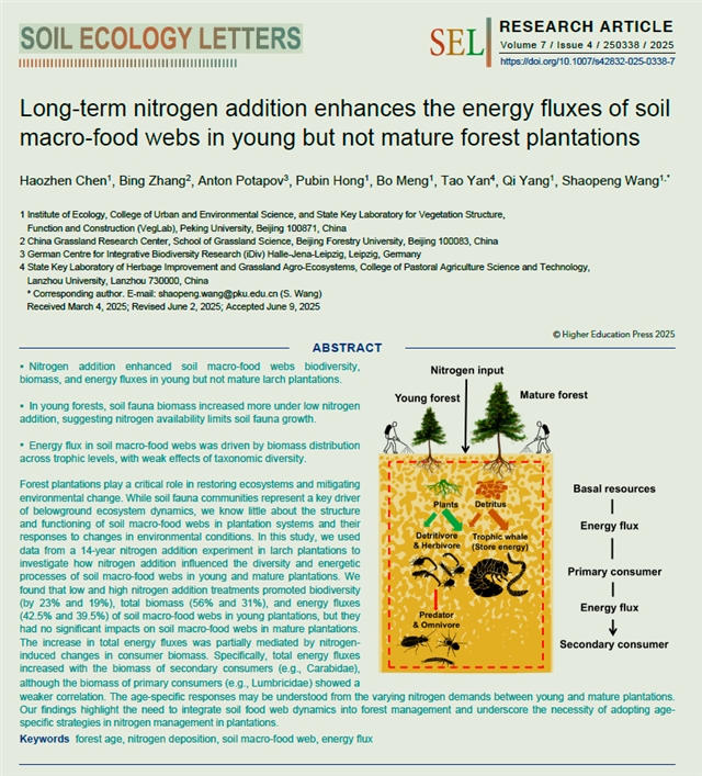 SEL Research | 长期氮添加显著增加了幼龄人工林中土壤食物网的能量通量 |