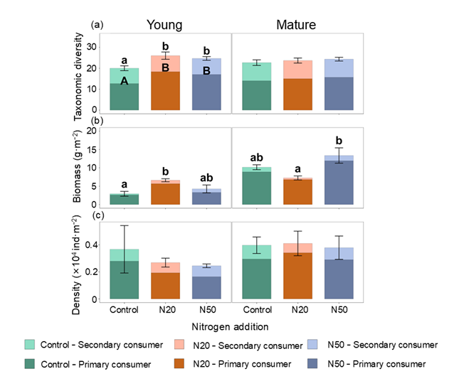 论文标题:Long-term nitrogen addition enhances the energy fluxes of soil macro-food webs in young but not mature forest plantations