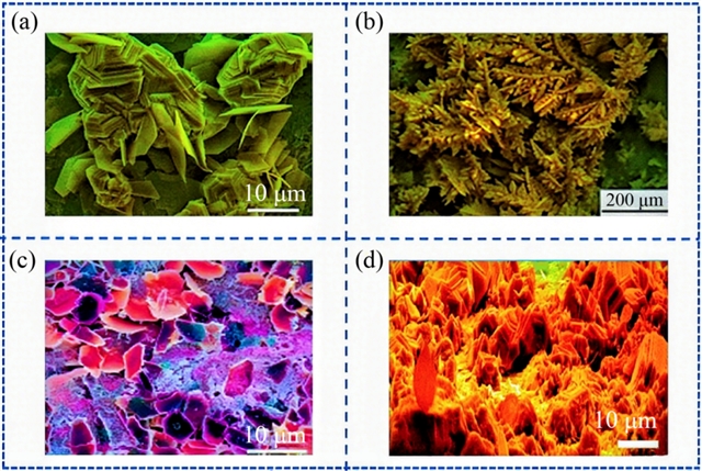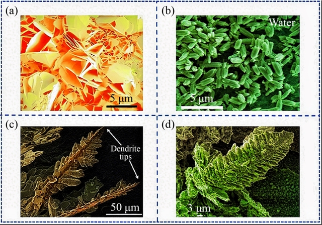 锌阳极在水性电解质中面临的主要挑战可归纳为锌枝晶生长、自腐蚀和析氢反应。锌枝晶的形成源于锌离子(Zn2+)在阳极表面分布不均,导致局部离子浓度梯度增大,并在电场作用下优先沉积于高曲率区域,形成树枝状结构。这些枝晶可能刺穿隔膜,引发电池短路。扫描电子显微镜研究显示,锌枝晶在不同尺度下呈现层状、棒状和羽状分支等形态,其生长受离子浓度梯度、电场分布和机械应力场动态耦合的影响。此外,锌阳极在弱酸性电解质中易发生自腐蚀反应,消耗活性物质并生成氢氧化锌、碱式硫酸锌等腐蚀产物,这些产物覆盖阳极表面,导致钝化并增加界面阻抗。析氢反应则主要发生在高倍率充放电过程中,产生的氢气气泡阻碍锌均匀沉积,并加速多孔副产物的积累。