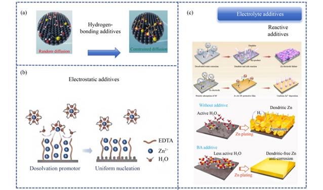电解质改性通过引入添加剂或调整溶剂组成,在分子水平上重构Zn2+的溶剂化结构,抑制副反应热力学驱动力。电解质添加剂可分为氢键型、静电型和反应型。氢键型添加剂如Tween-80,通过其羟基和醚基替代水分子在Zn2+溶剂化鞘中的位置,重构氢键网络,减少活性水参与析氢反应。静电型添加剂如钠离子(Na+),在锌阳极表面形成正静电屏蔽层,利用静电排斥效应抑制枝晶生长。反应型添加剂则通过与Zn2+反应生成不溶性产物,覆盖阳极表面形成稳定SEI层。此外,电解质系统设计包括氢基电解质、高浓度电解质和pH缓冲电解质。高浓度电解质形成“盐包水”结构,减少自由水含量,抑制析氢和腐蚀;pH缓冲电解质如吡啶,通过质子捕获机制维持电解质pH稳定,提高析氢过电位。