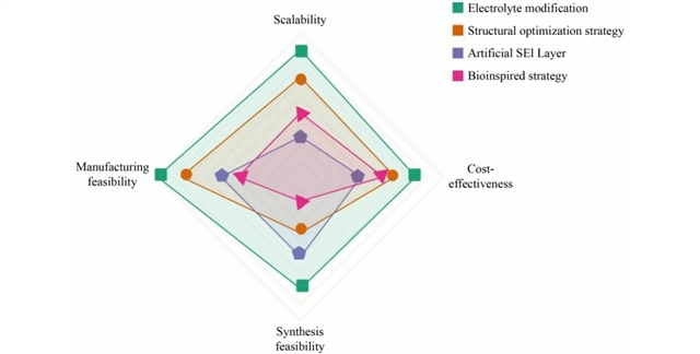 图6 锌阳极稳定策略在商业应用中的可行性比较——基于可扩展性、成本效益、合成可行性及制造可行性