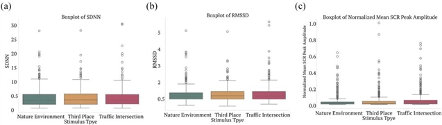 ▲ 图四:三种实验条件下生理反应的箱线图。(a)正常心跳间期标准差(SDNN);(b)相邻心跳间期差值均方根(RMSSD);(c)标准化平均皮肤电反应(SCR)峰值振幅。©本文作者