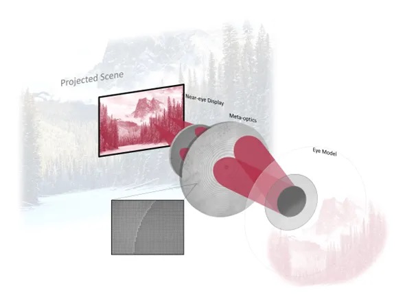 研究团队利用先进的纳米制造技术和超表面光学原理提出了一种新型超表面双透镜眼镜片。这种镜片展示了超表面光学在高性能近眼显示系统开发中的潜力。研究人员通过精心设计和制造,使得该眼镜片在633纳米波长下,展现出了与传统折射透镜系统相媲美的性能。