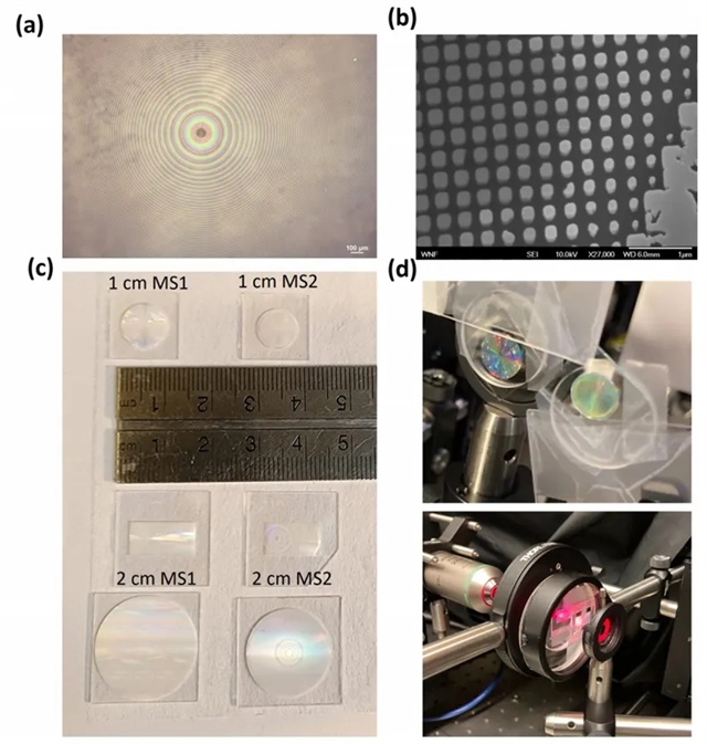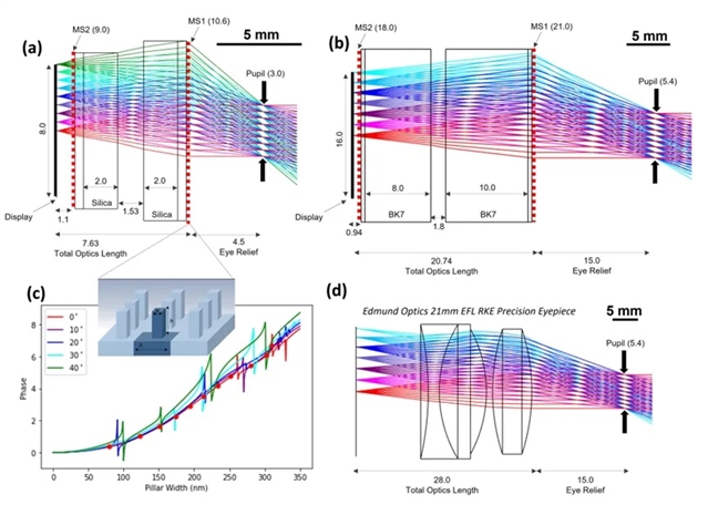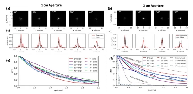 在设计和建模方面,研究团队采用了逐步的方法来实现大口径光学系统。实验与理论结果在两组光学元件上都显示出极好的一致性。与类似的商业折射透镜眼镜片系统相比,超表面系统在设计波长下在宽视场上提供改进的图像质量,并减少了总轨道长度。