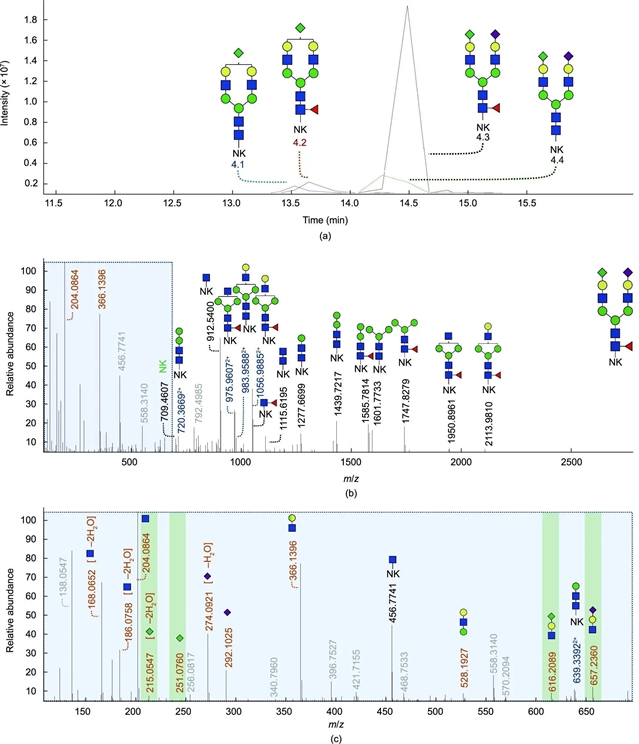 文章指出,为了获得有关这些异构体是否与Kdn不同唾液酸连接相关的信息,分析了唾液酸连接特异性衍生的胰蛋白酶PSA糖肽。结果表明,Neu5Ac唾液酸化触角连接存在差异,而仅在α2,3结构中观察到Kdn唾液酸化触角。这些发现与之前的一项研究相反,该研究报道了人类前列腺癌(PCa)组织中复合型游离N-聚糖的积累,Kdn以α2,3和α2,6结构与半乳糖相连。此外,研究人员指出,α2,6-Kdn N-聚糖是这些样品的主要形式,其积累很可能与降解不足有关。需要注意的是,在本文中,α2,6-Kdn N-聚糖仍然可能存在于PSA上,但低于分析方法的检测限度。此外,通过多孔石墨化碳(PGC)-nanoLC-MS分析解决了Kdn触角占用问题,表明该问题是含Kdn聚糖异构体分离的主要决定因素。