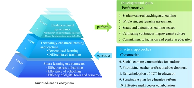为了更好地实施数字教学法,文章提出建立智慧教育系统的构想,旨在促进以学习者为中心的教学,全面评估智慧学习的环境及其包容性。该系统包含三个层次:智慧学习环境、技术增强的学习与教学,以及基于证据的管理。
