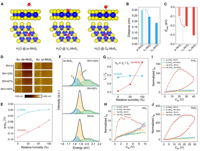 基于上述关键问题,受生物“气体-受体”信号通路的启发,清华大学刘锴团队与谷林团队合作,提出了一种气体(H2O)-受体(缺陷)协同作用机制,使MoS2横向忆阻器阻变比提升了超过10000倍。其中,气体是指环境中以H2O为代表的气态掺杂分子,受体是指通过激光直写局域热氧化法在二维TMDCs材料中人为引入的缺陷。