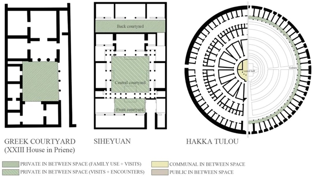 ▲ 图三:希腊庭院、四合院、客家土楼中的灰空间。©本文作者。资料来源:Gonza´lez Capitel (2005), Zhang (2020), Colafranceschi et al. (2020).