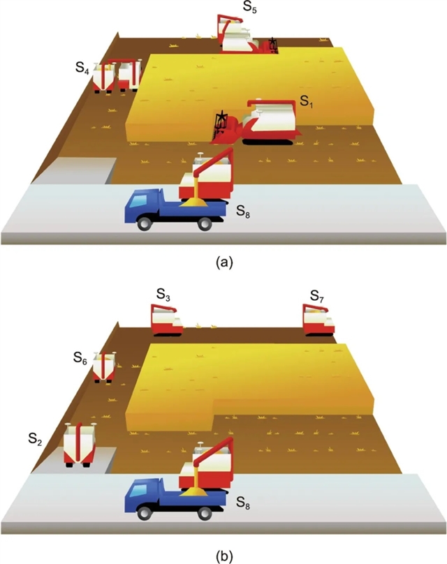图2. HUT 协同作业的主要阶段(S1-S8)和流程。(a)收获机和运粮车协同卸粮的示意图。(b)运粮车的五个停车状态。