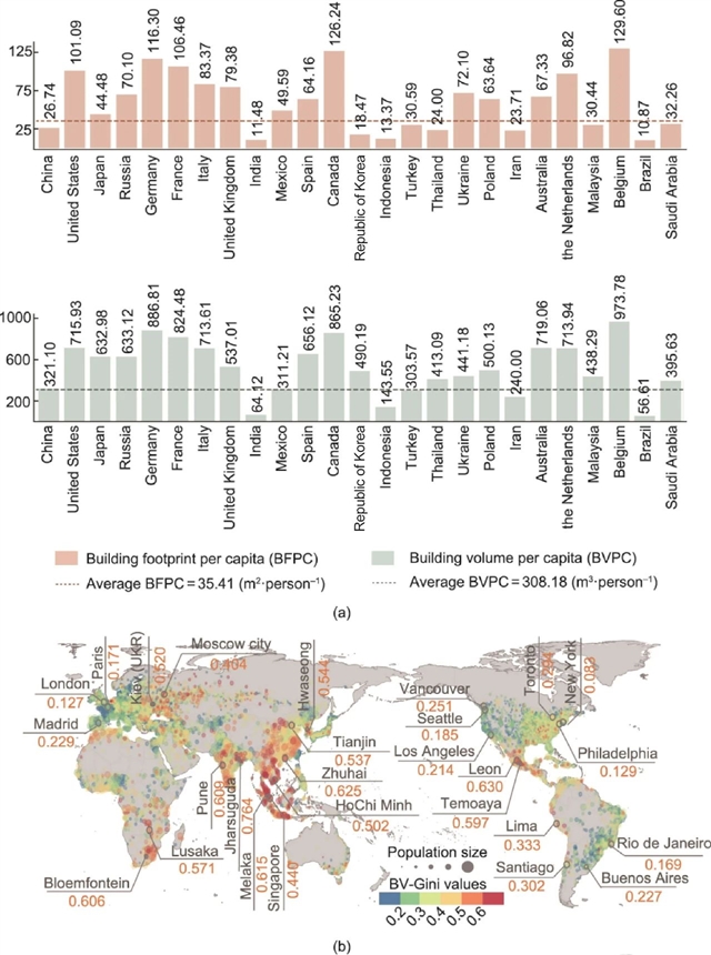 图3. 城市人均建筑体积的供给和不平等性。(a) 前25个建筑体积最大国家的人均建筑体积(下)和人均建筑占地面积(上),虚线表示全球平均值。(b) 全球城市群的城市级别基尼系数。颜色越暖表示BVPC不平等程度越高。