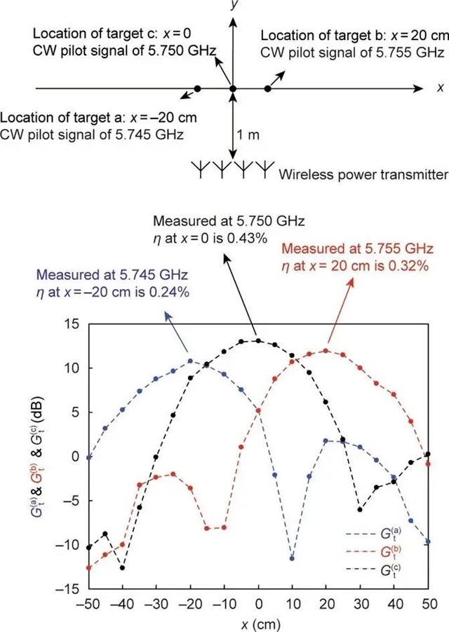 实验结果表明,当多个目标发射不同频率的连续波导引信号时,只要这些导引信号被无线功率发射器明确地区分,回复反射无线功率发射器就能够产生多个靶向对应目标的无线功率波束。然而,当多个目标的导引信号不能被无线功率发射器适当地区分开来时,就会出现各种复杂的实际问题。具体而言,当多个导引信号以相同频率传输时,无线功率传输性能在很大程度上取决于导引信号之间的相互作用。这在实际应用中是非常不可取的。因此,在多目标回复反射无线功率传输过程中,区分多个目标发出的导引信号是极为关键的。