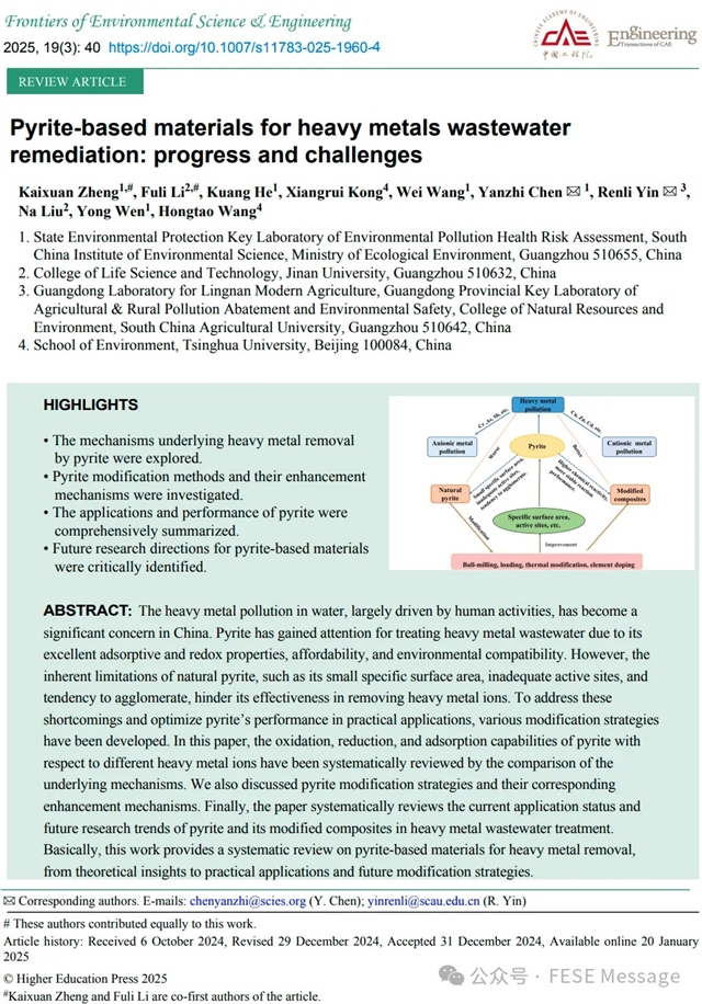 本文内容来自FESE期刊2025年第19卷第3期发表的综述文章“Pyrite-based materials for heavy metals wastewater remediation: progress and challenges”。通讯作者为生态环境部的陈岩贽博士和华南农业大学的银仁莉副教授。