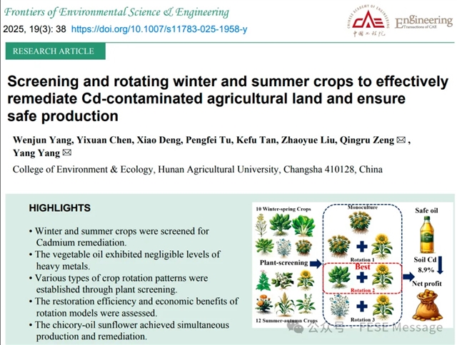 本文内容来自FESE期刊2025年第19卷第3期发表的研究文章“Screening and rotating winter and summer crops to effectively remediate Cd-contaminated agricultural land and ensure safe production”。通讯作者为湖南农业大学的曾清如教授和杨洋副研究员。