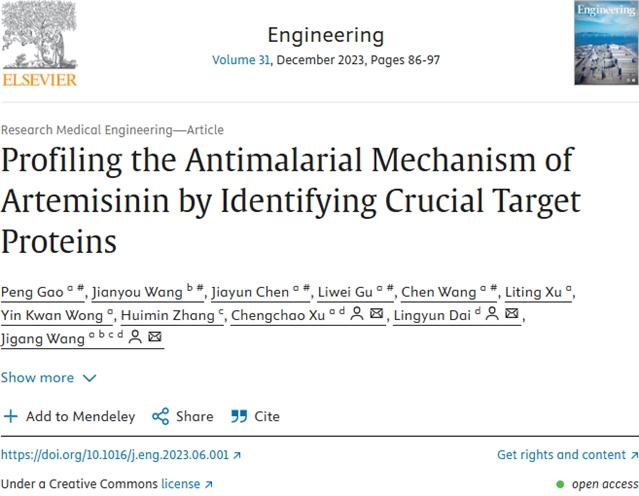 Peng Gao, Jianyou Wang, Jiayun Chen, Liwei Gu, Chen Wang, Liting Xu, Yin Kwan Wong, Huimin Zhang, Chengchao Xu, Lingyun Dai, Jigang Wang. Profiling the Antimalarial Mechanism of Artemisinin by Identifying Crucial Target Proteins. Engineering, 2023, 31(12): 86–97.https://doi.org/10.1016/j.eng.2023.06.001