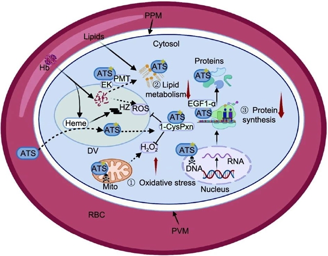 图1. ATS 同时干扰恶性疟原虫体内①氧化还原平衡、②脂质代谢和③蛋白质合成,通过靶向几种必需蛋白发挥抗疟作用。DV:消化泡;HZ:疟色素;Mito:线粒体。
