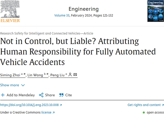Siming Zhai, Lin Wang, Peng Liu. Not in Control, but Liable? Attributing Human Responsibility for Fully Automated Vehicle Accidents. Engineering, 2024, 33(2): 121–132https://doi.org/10.1016/j.eng.2023.10.008
